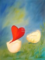 Behütet im Ei, bricht es nun entzwei.
